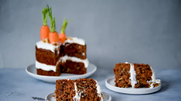 8. Garneer de taart met de achtergehouden walnoten en steek de drie hele worteltjes in de taart ter decoratie.