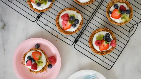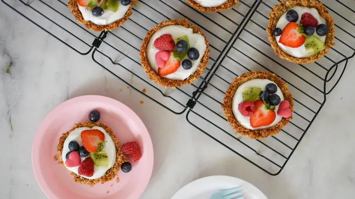 1. Verwarm de oven voor op 175 °C. 2. Doe de noten in een keukenmachine en maal ze fijn. Verplaats de gemalen noten naar een kom en voeg hier de havervlokken en kaneel aan toe. Roer het geheel door elkaar. 3. Voeg vervolgens de agavesiroop, Blue Band vloeibaar en vanille-extract aan toe. Roer het geheel door elkaar en verdeel de granola over de taartvormpjes. 4. Bak de granolabodems 15-20 minuten in de oven totdat ze goudbruin zijn. 5. Haal de granolabodems wanneer ze afgekoeld zijn uit de vormpjes, vul de taartbodems met kokosyoghurt en garneer met kiwi, aardbeien en blauwe bessen.