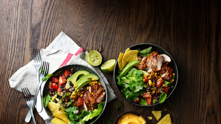 1. Kruid de kipfilets met de Taco Seasoning mix. 2. Bak de kip in olie aan weerszijden in een medium warme pan tot goudbruin en gaar. 3. Zet apart om af te koelen. 4. Meng de ingrediënten voor de salade met de bonen, tomaten en groene chili. Breng op smaak met zout. 5. Verdeel de salade en de groenten over vier kommen. 6. Snijd de kip en leg mooi decoratief in de kommen. 7. Leg de tortilla chips ernaast. Garneer met koriander en serveer met kaasdip.