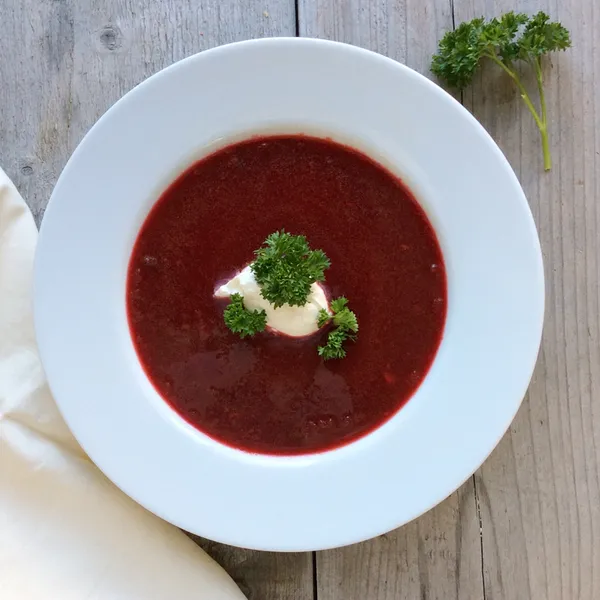 Nodig voor vier kommen: - 600 gram rauwe bietjes - 240 gram gepelde tomaten - 2 tenen knoflook, geperst - 5 cm verse gember, geraspt - Snuf chilipeper - Snuf zeezout - 4 tl zure room - Een handje verse peterselie - Scheutje olijfolie