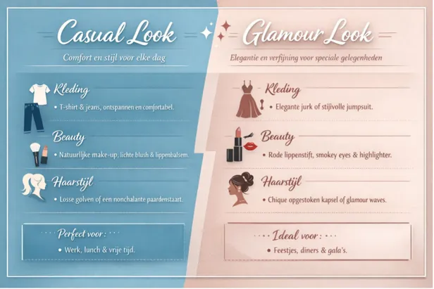 - Casual look: Voor een dagelijkse look kun je kiezen voor comfortabele kleding en subtiele beauty-opties. Een simpel T-shirt met een jeans, gecombineerd met een lichte make-up en een nonchalante haarstijl, zorgt voor een zorgeloze uitstraling.
